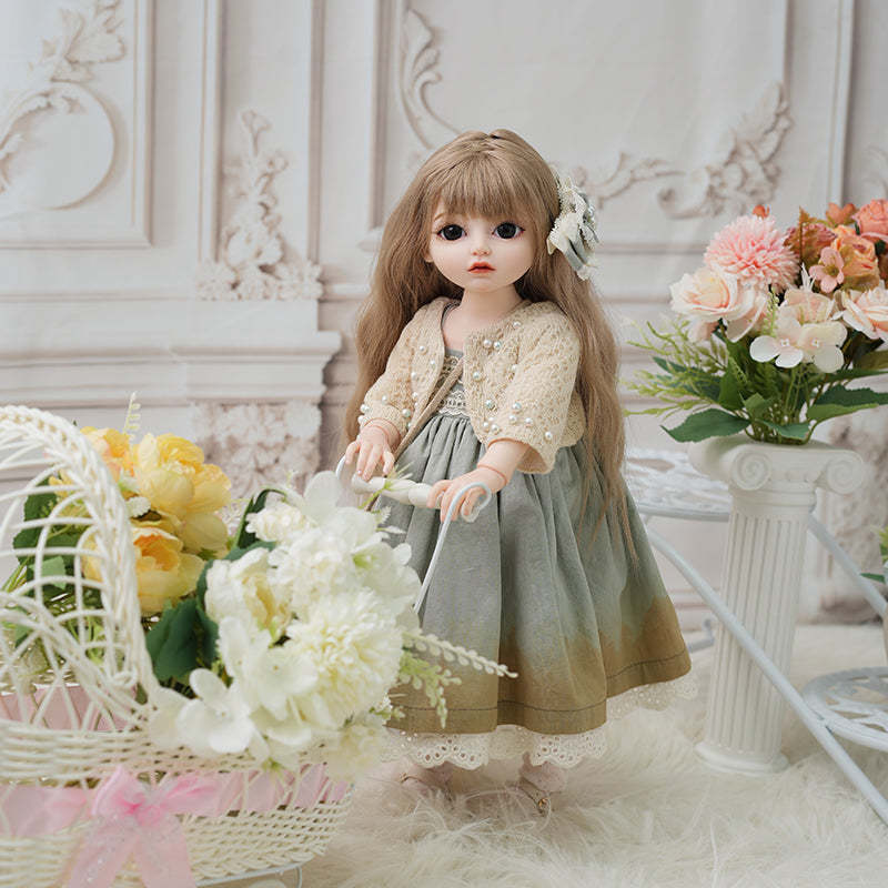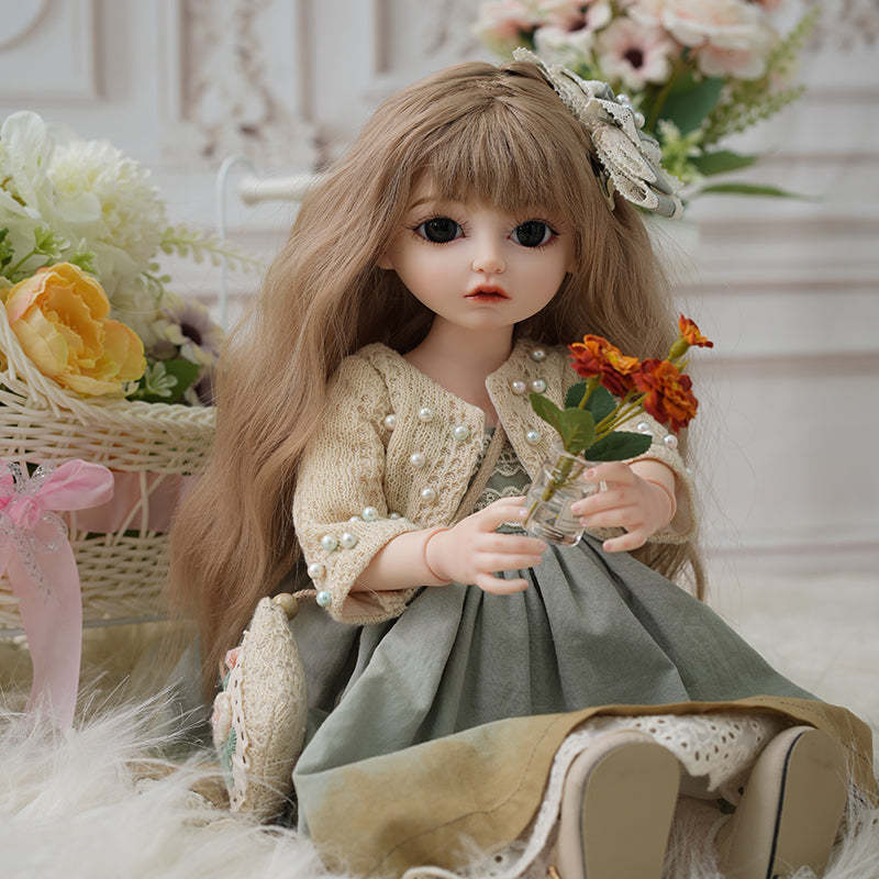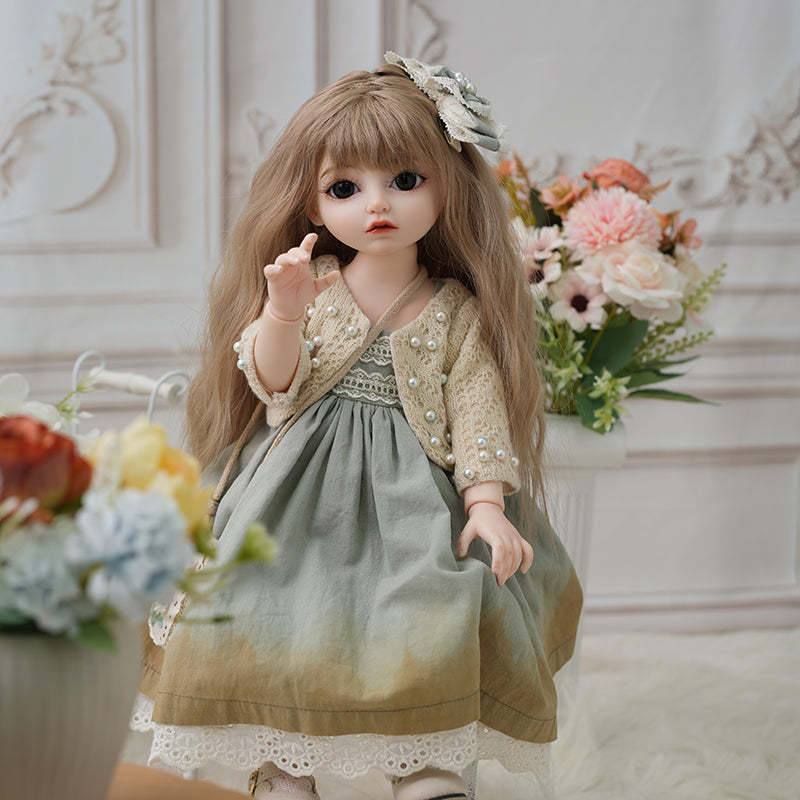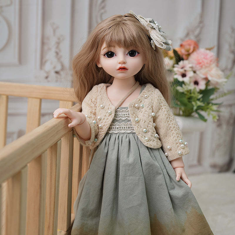 -Delicate Outfit: Wears a soft green lace-trimmed dress paired with a beige knitted cardigan featuring pearl-like buttons. The floral headpiece complements the pastoral theme.