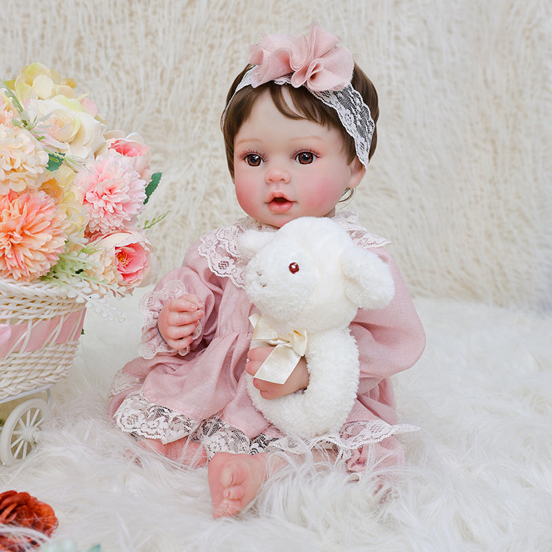 This is a 20-inch, full-vinyl reborn baby girl whose lifelike artistry invites gentle interaction and heartfelt connection. With realistic vinyl skin, hand-rooted brown hair, expressive brown acrylic eyes, and a serene expression, the baby doll brings warmth, beauty, and emotional comfort into any space.