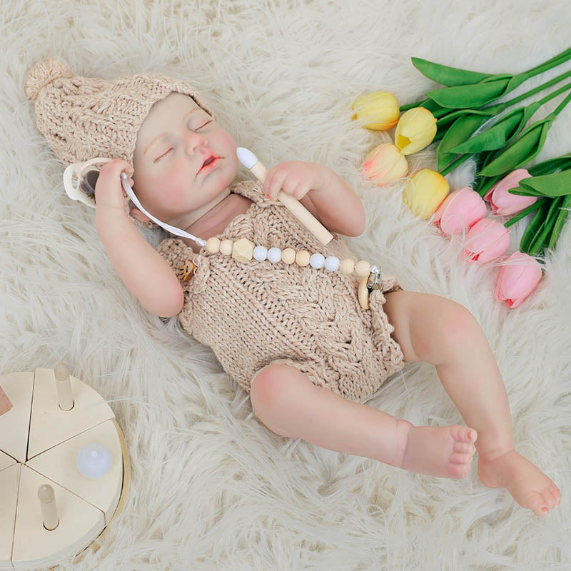 This is a realistic 20-inch reborn baby doll made from sturdy hard vinyl. With a serene sleeping expression, finely painted scalp, and delicate vinyl skin, the baby doll is designed for emotional comfort, realistic display, and gentle companionship—whether for nurturing play or quiet moments of reflection.