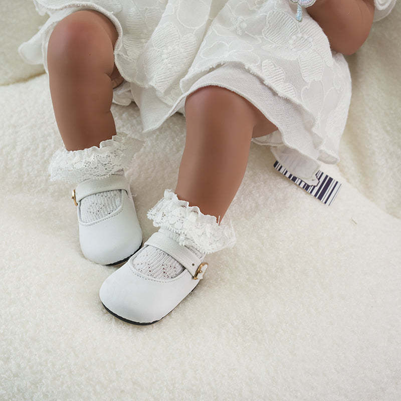 Sweet Footwear & Socks: Frilly lace-trim socks and classic white Mary Jane shoes complete her ensemble, making every outfit change a delightful moment.